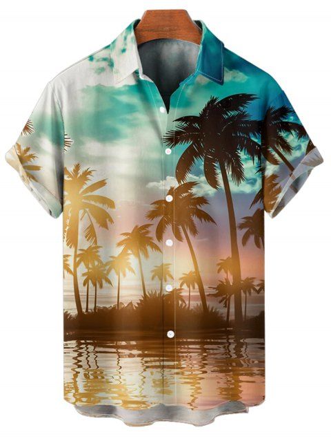 Chemise de plage boutonnée pour homme, imprimé cocotiers et coucher de soleil
