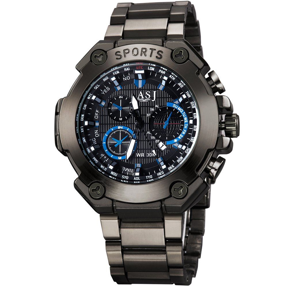 ASJ mode masculine de sport en acier inoxydable calendrier étanche montre à quartz