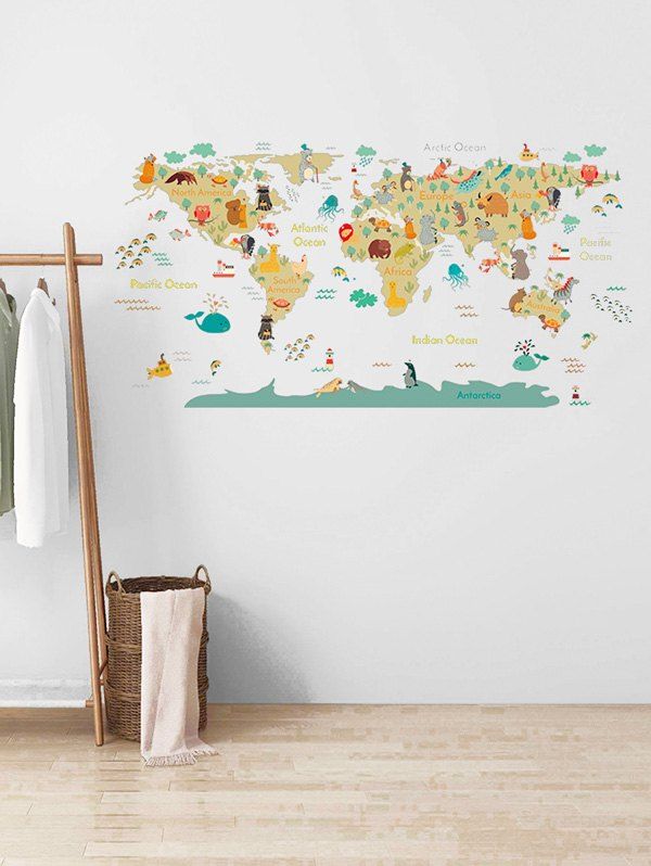 Autocollant Mural Amovible Carte du Monde et Animal Dessin Animé Imprimés