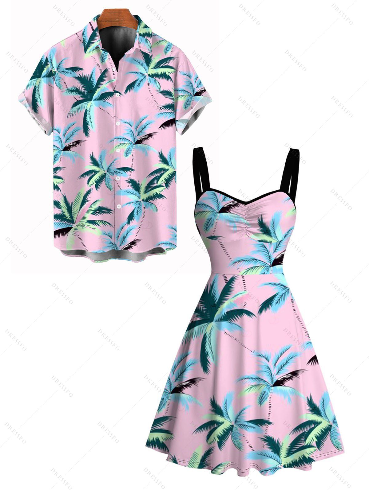 Beach Couple Outfit Colored Coconut Tree Print Ruched Dress and Shirt Set - Rose clair S | US 4