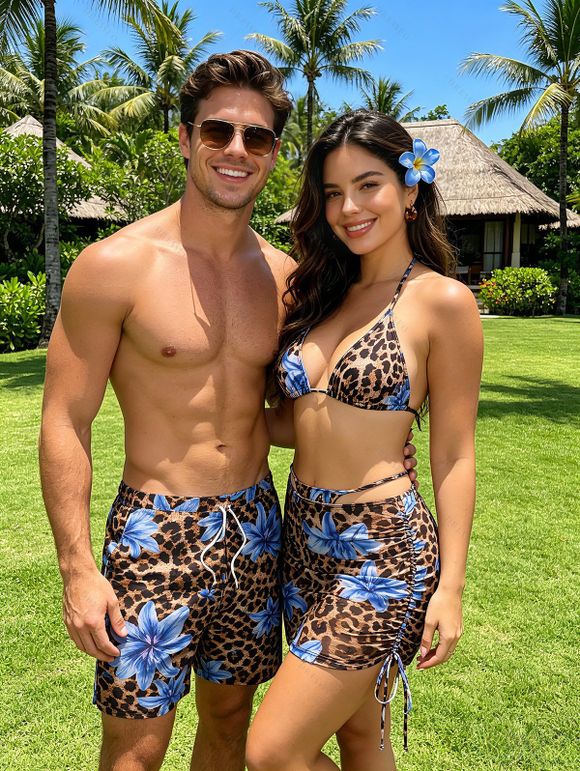 Beach Couple Outfit Leopard Lily Floral Print Cinched Skirt Halter 3 Pcs Bikini Swimsuit and Drawstring Shorts Set