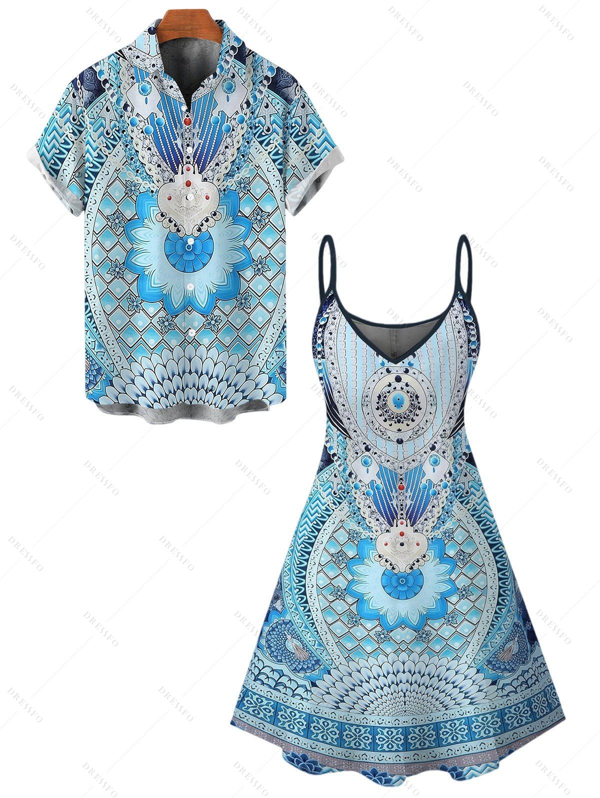 Bohemian Couple Outfit Geometric Ethnic Print Spaghetti Strap Dress and Shirt Set - Bleu Toile de Jean S | US 4