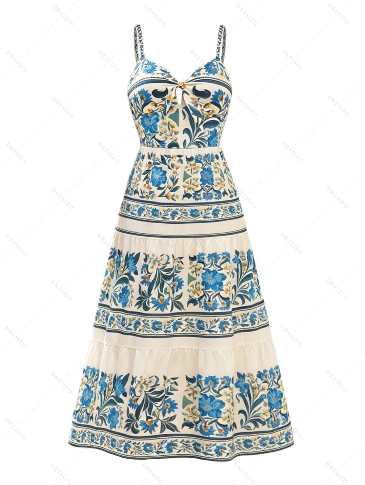 Bohemian Vacation Dress Floral Leaf Ethnic Print Bowknot Tiered Boho Dress