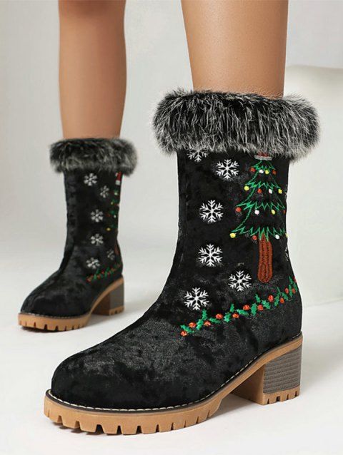 Embroidered Sunflower Leaf Pattern Zipper Up Pointed Toe Chunky Heels Outdoor Mid Calf Boots