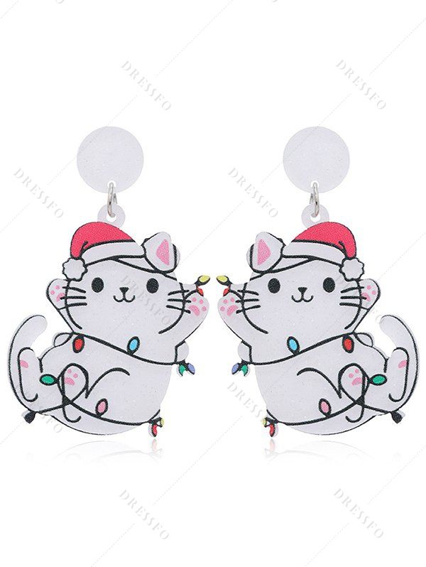 Boucles d'oreilles de fête en forme de chat avec chapeau de Noël et chaînes éclair - Blanc