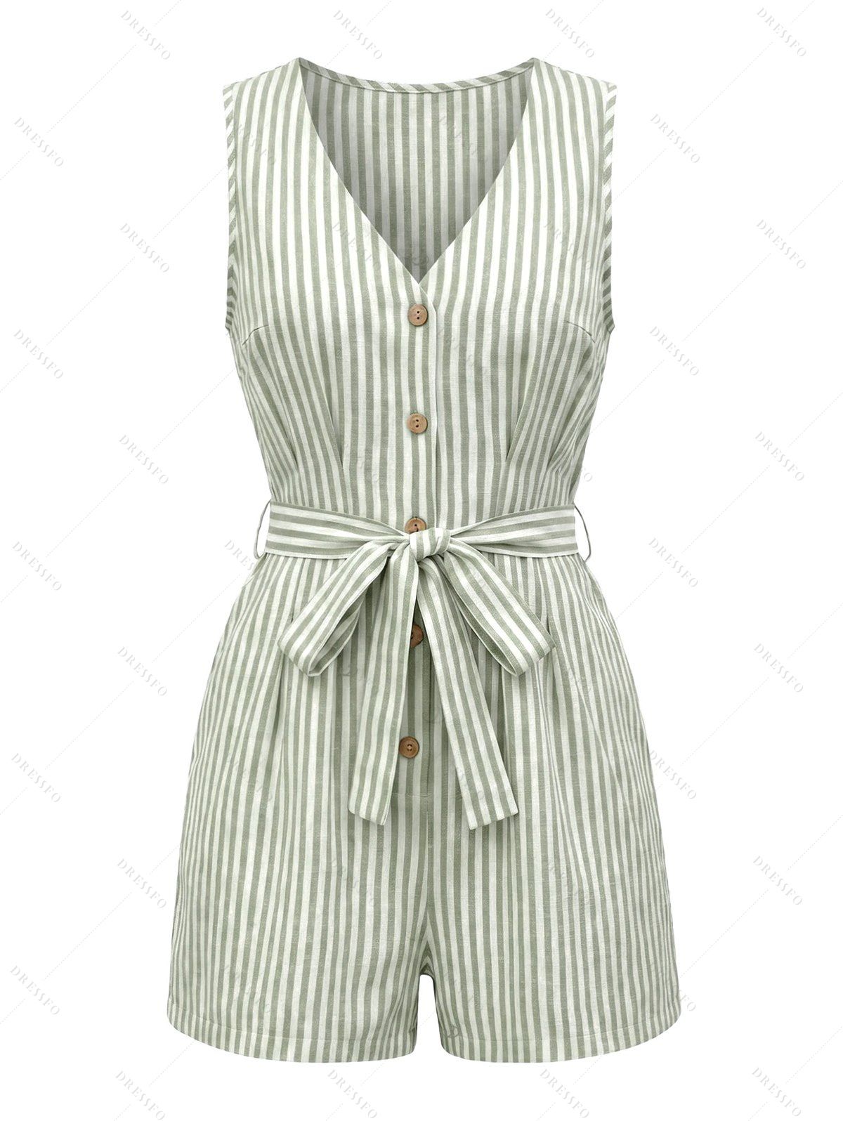 Casual Romper Striped Print V Neck Button Belt Romper - Vert XL | US 12