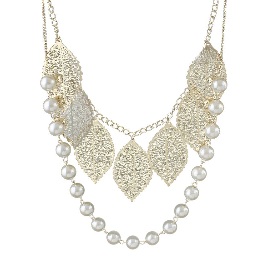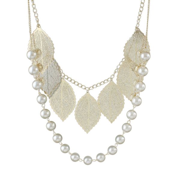 Chaîne longue en métal Fashion avec collier de perles de feuille de charme - Or