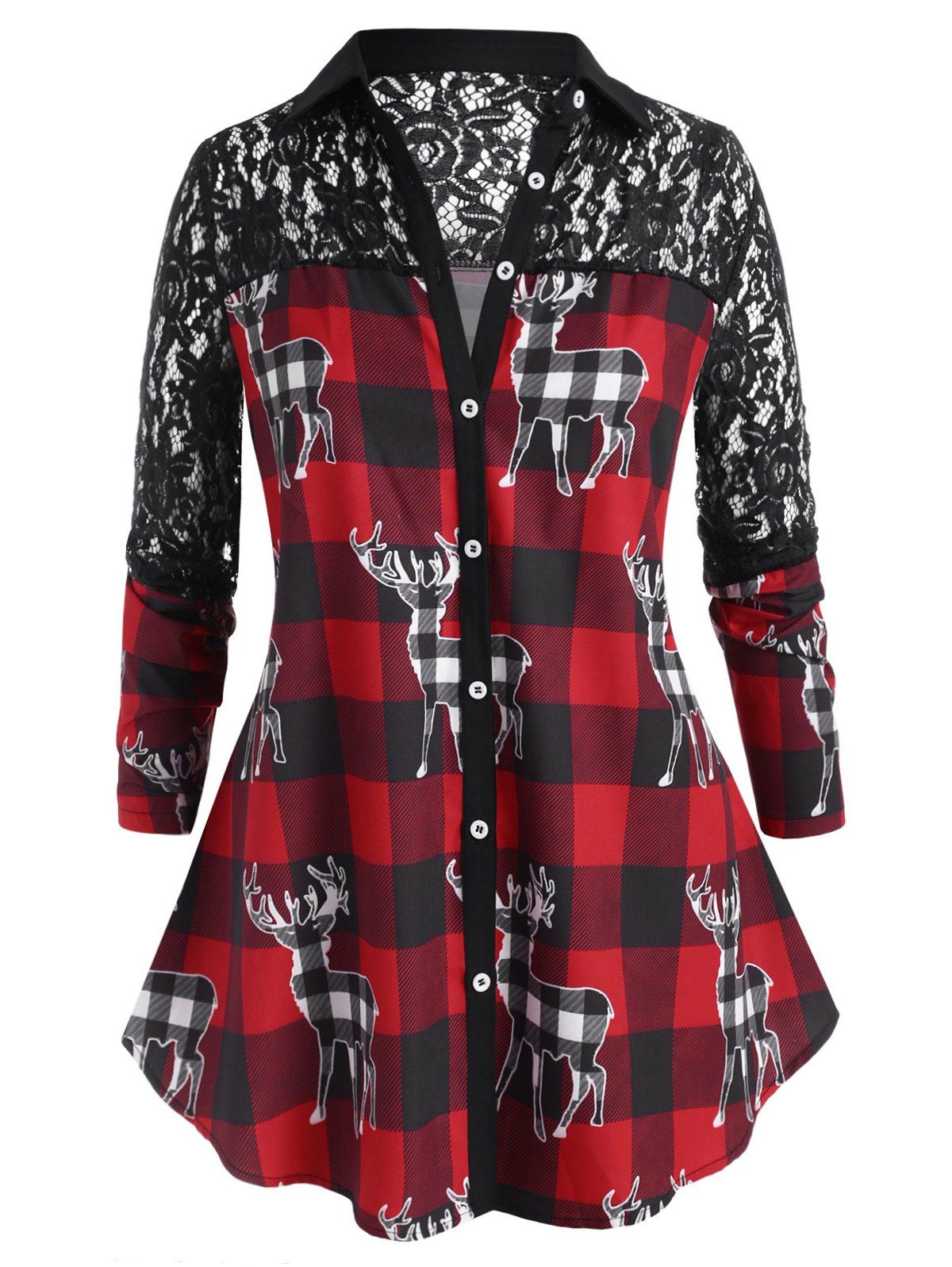 Chemise à Imprimé Cerf de Noël Panneau en Dentelle à Carreaux de Grande Taille