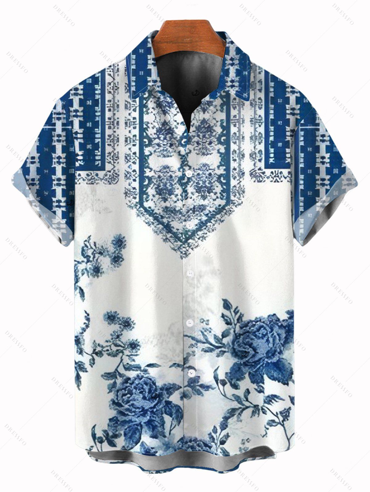 Chemise de vacances pour homme, bleu et blanc, imprimé roses porcelaine, boutonnée