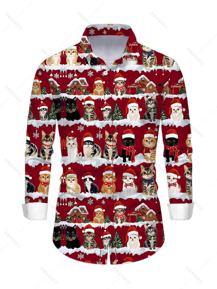 Chemise de vacances pour homme, imprimé arbre de Noël, chat et chapeau, manches longues - Rouge 5XL