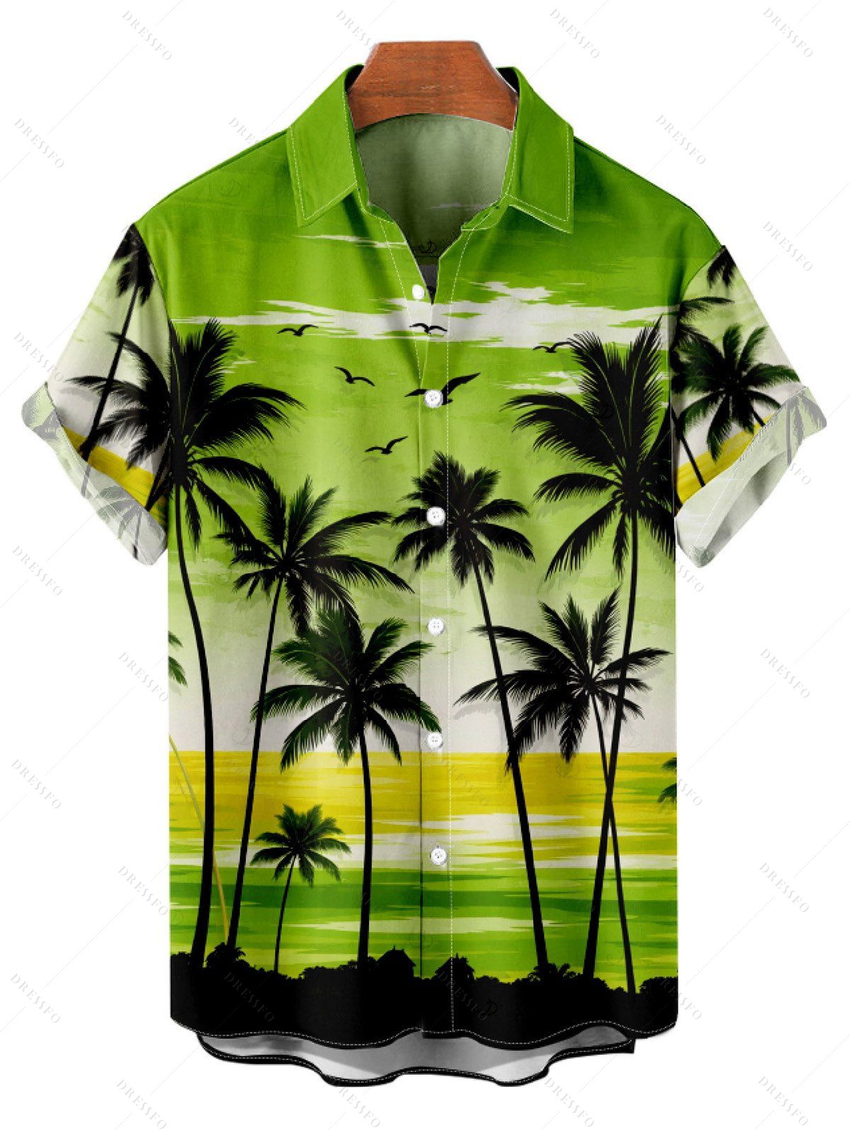Chemise de vacances pour homme, imprimé coucher de soleil tropical avec cocotiers, chemise boutonnée - Vert 5XL
