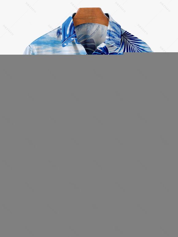 Chemise de vacances pour homme à imprimé feuilles de cocotier et de monstera, boutonnée - Bleu Ciel 5XL