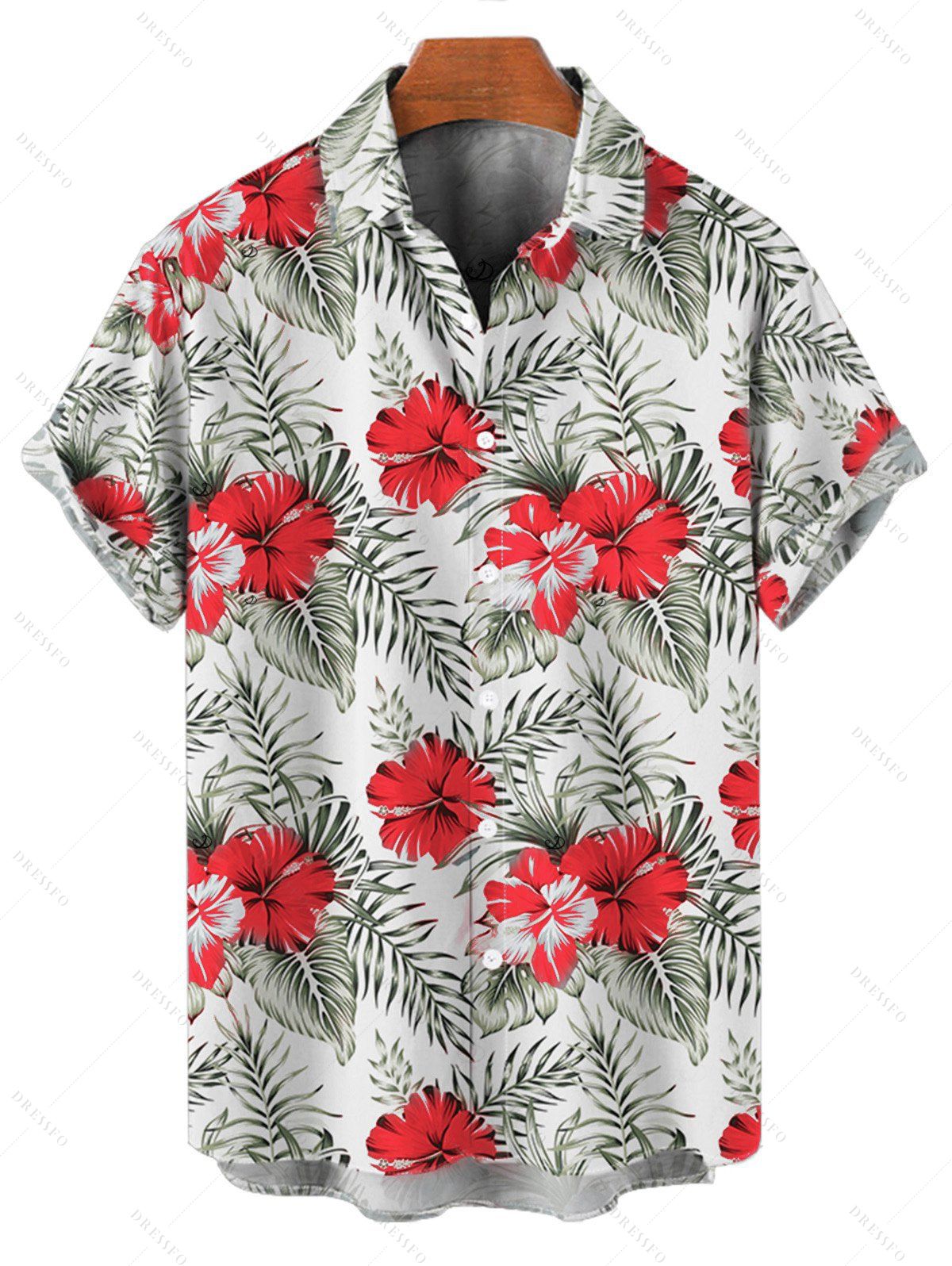 Chemise de vacances pour homme à motif de fleurs d'hibiscus, boutonnée et retroussée, à manches courtes, décontractée - Rouge S