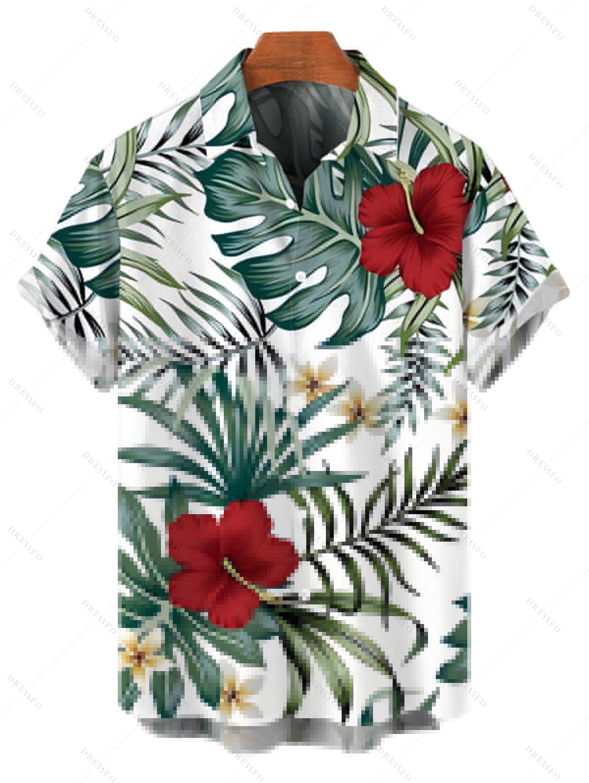 Chemise hawaïenne pour homme, imprimé floral à feuilles de palmier et hibiscus, à boutons