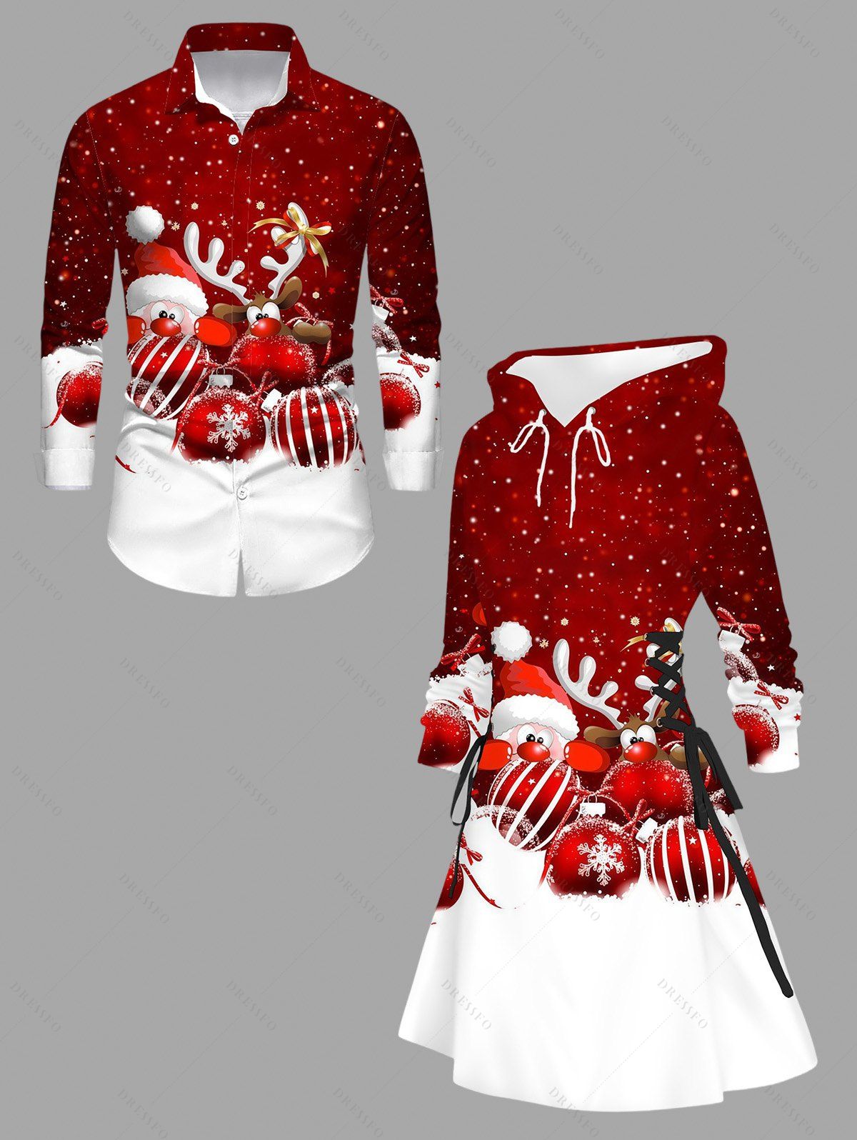 Christmas Couple Outfit Elk Santa Claus Bell Print Hoodie Dress and Shirt Set - Rouge Vineux S | US 4