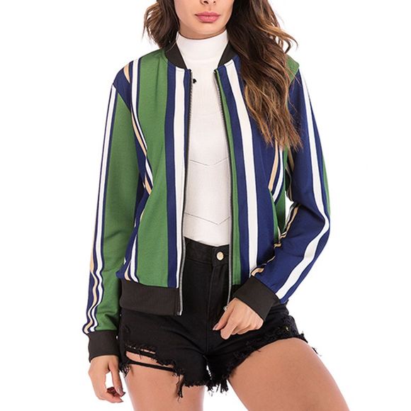 Col d'automne collier rayure couleur fermeture éclair manches longues manteau de baseball veste veste - Vert Printemps Moyen 2XL