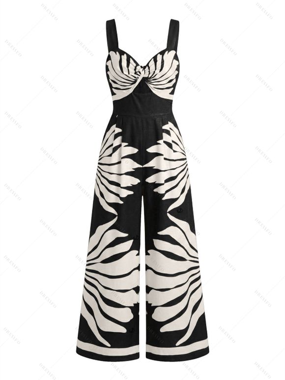 Combinaison de vacances à imprimé feuilles et jambes larges torsadées - Noir S | US 4