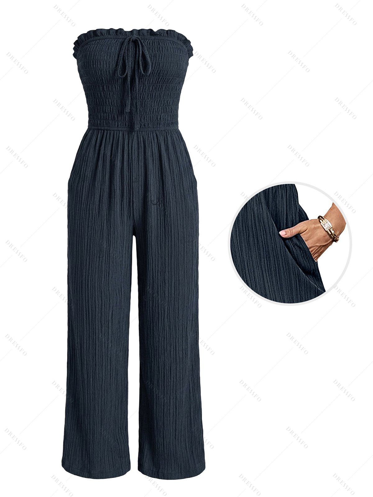 Combinaison de vacances unie texturée, à volants smockés, poche nouée, épaules dénudées et jambes larges. - Bleu de Minuit XL | US 10