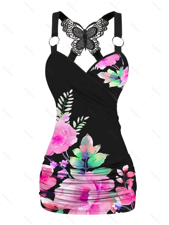 Débardeur de vacances imprimé fleurs et feuilles, dentelle, papillon froncé - Noir L | US 8-10