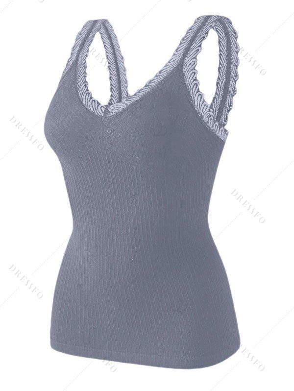Débardeur en maille à col V et empiècement en dentelle festonnée côtelée - Gris ONE SIZE