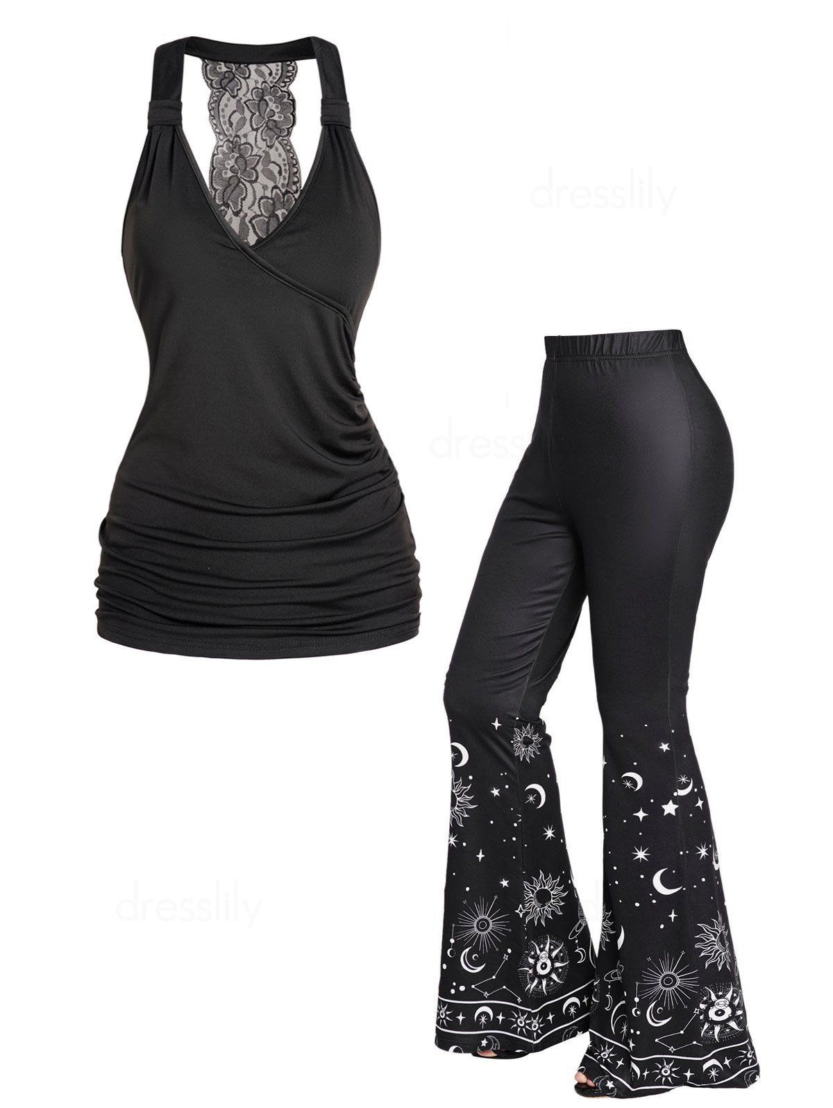 Ensemble de Débardeur Evasé Croisé en Dentelle et Pantalon Evasé à Imprimé Etoile Lune et Soleil