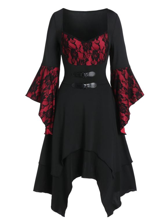 Deux tons dentelle Flare manches Mouchoir Robe - Noir 3XL