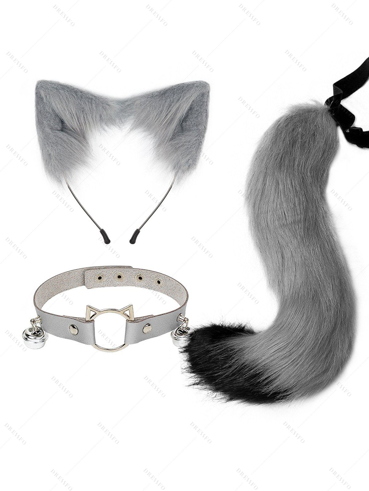 Ensemble de cosplay 3 pièces avec queue en fourrure artificielle et serre-tête oreilles de chat avec clochette - Gris