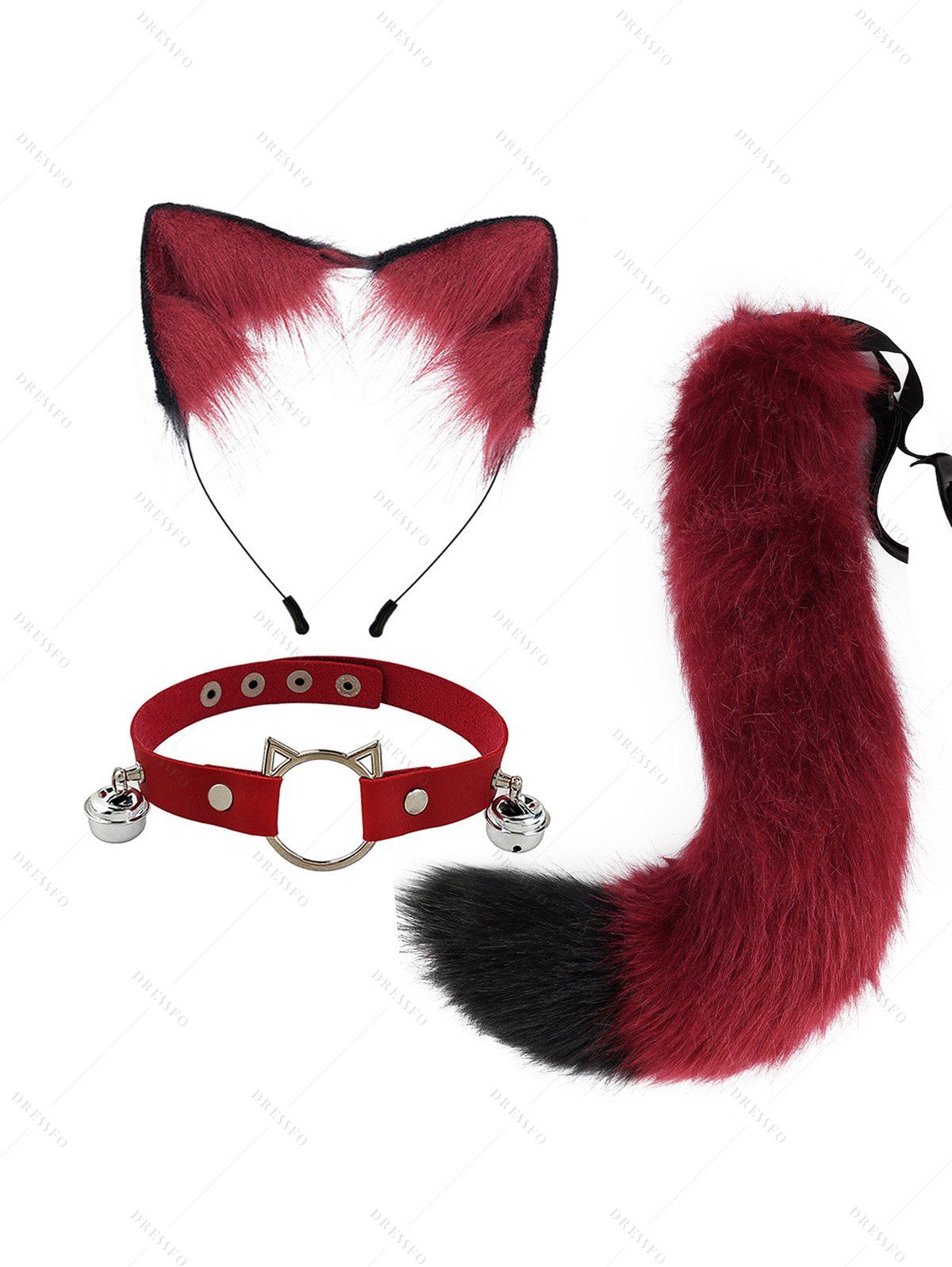 Ensemble de cosplay 3 pièces avec queue en fourrure artificielle et serre-tête oreilles de chat avec clochette - Rouge