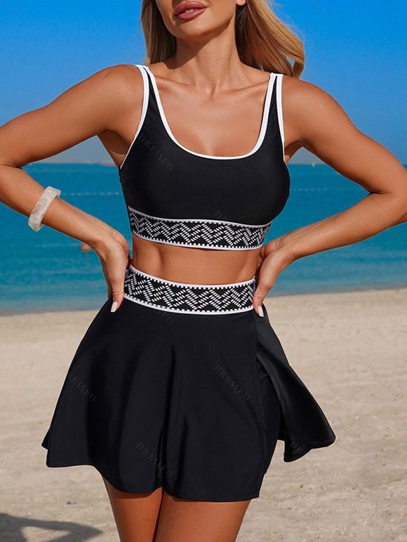 Ensemble de maillot de bain tankini de plage, soutien-gorge à imprimé zigzag et jupe fendue à poches - Noir S | US 4