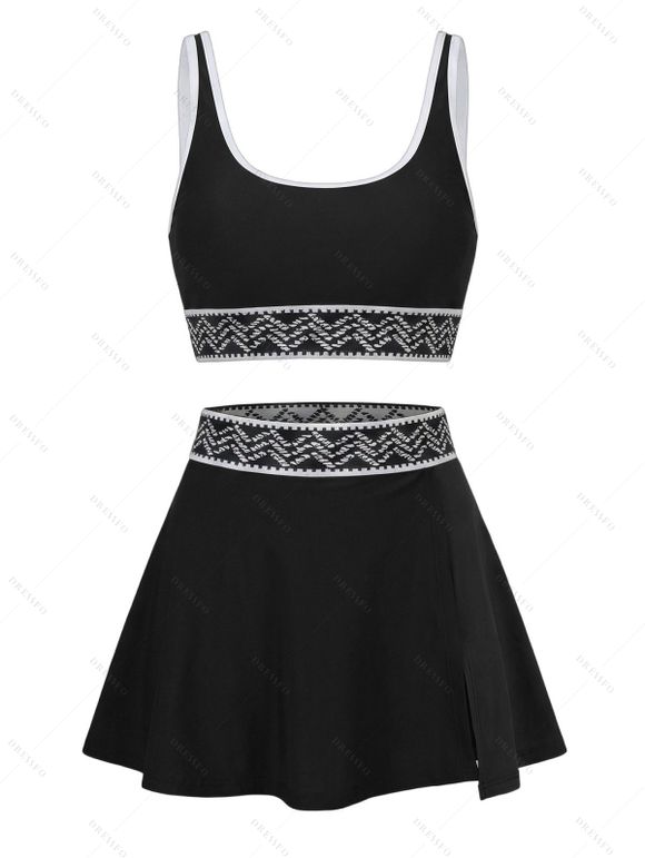 Ensemble de maillot de bain tankini de plage, soutien-gorge à imprimé zigzag et jupe fendue à poches - Noir M | US 6