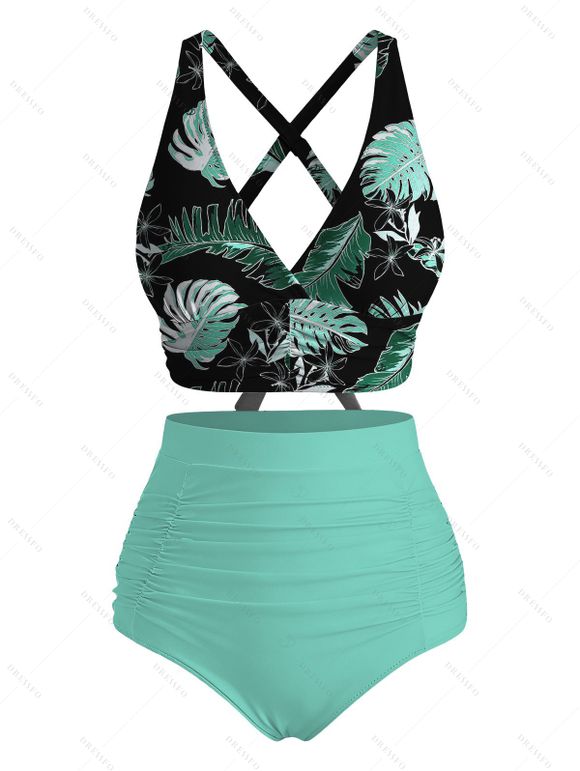 Ensemble de maillot de bain tankini de vacances, imprimé feuilles de monstera, shorty froncé croisé - Turquoise Foncée XXL | US 14