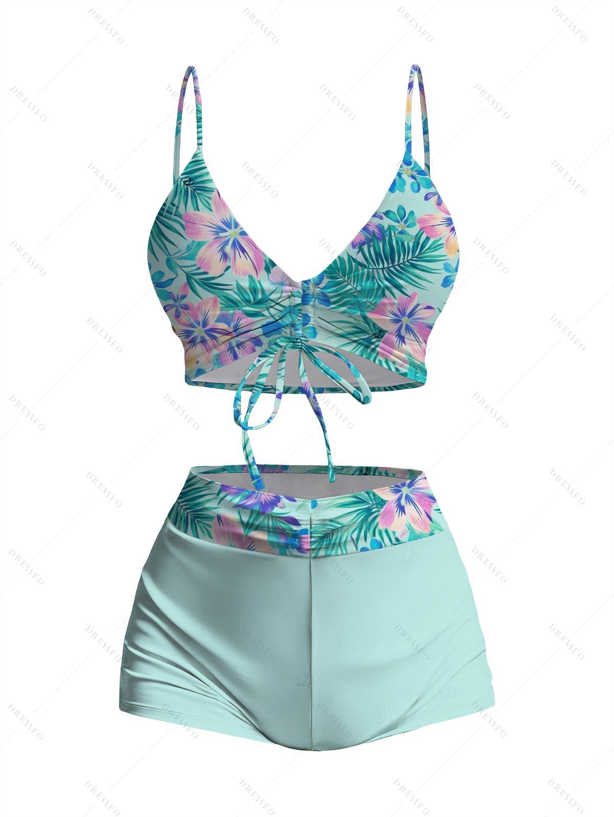 Ensemble de maillot de bain tankini de vacances, imprimé floral tropical hibiscus et palmiers, shorty resserré