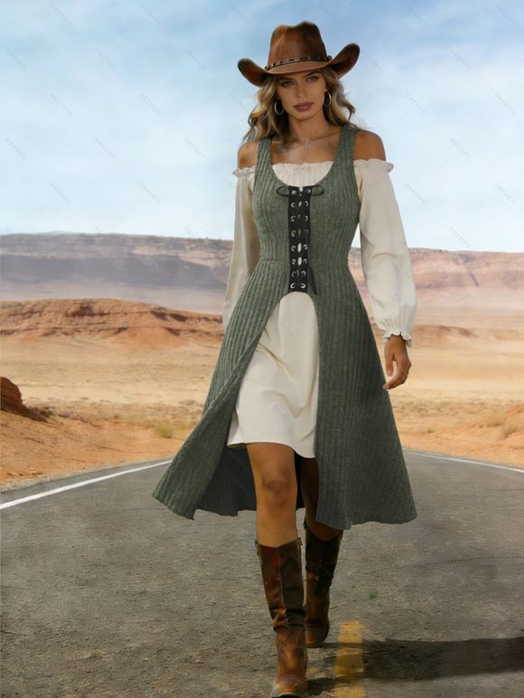 Ensemble de Robe à Epaule Dénudée à Volants et de Mini-Haut Côtelé à Lacets Deux Pièces