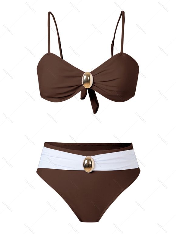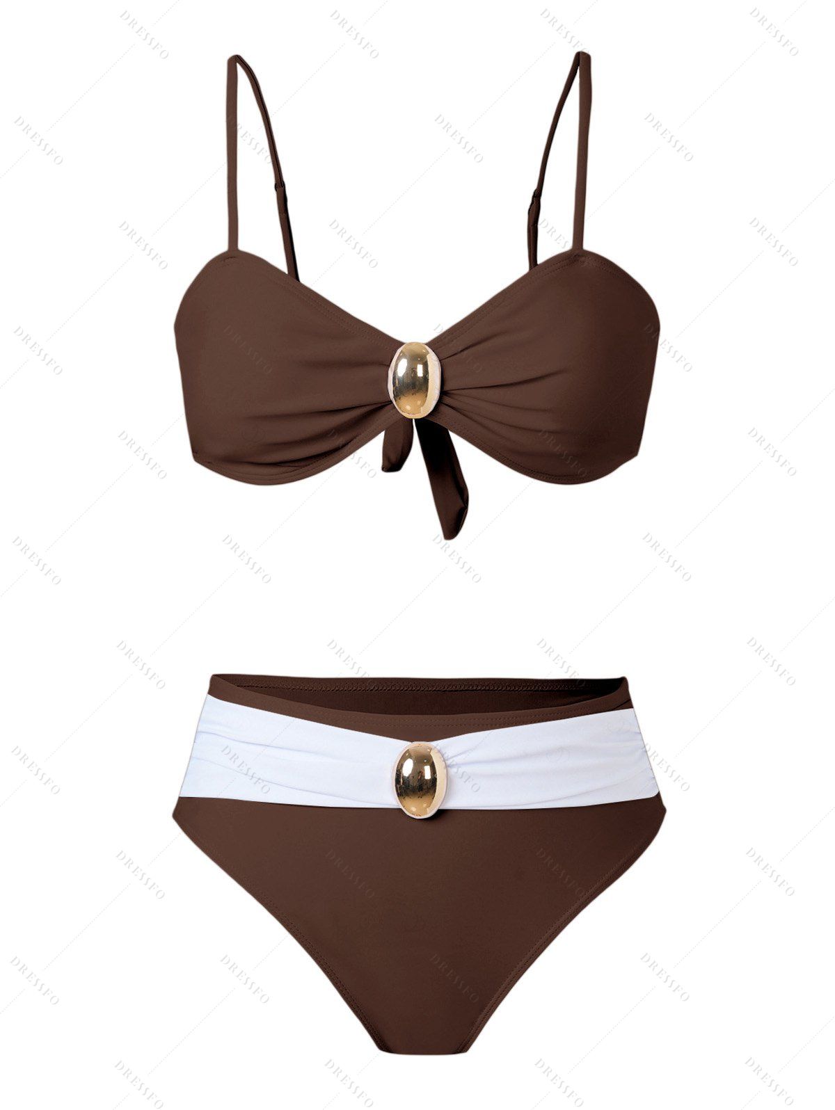 Ensemble maillot de bain de plage avec ornement métallique, nœud papillon dans le dos, culotte taille haute - Brun XL | US 10