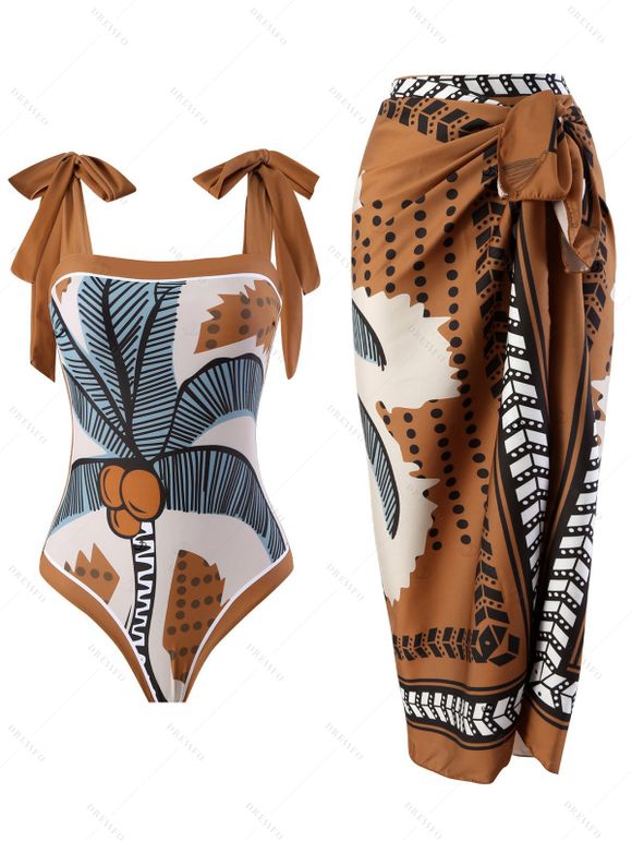 Ensemble maillot de bain une pièce vintage à imprimé tropical cocotier et nœud papillon, avec jupe de plage assortie. - Brun Légère XL | US 10