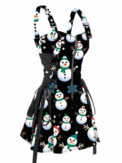 Robe de Noël à lacets et bretelles à boucle, imprimé bonhomme de neige et flocon de neige