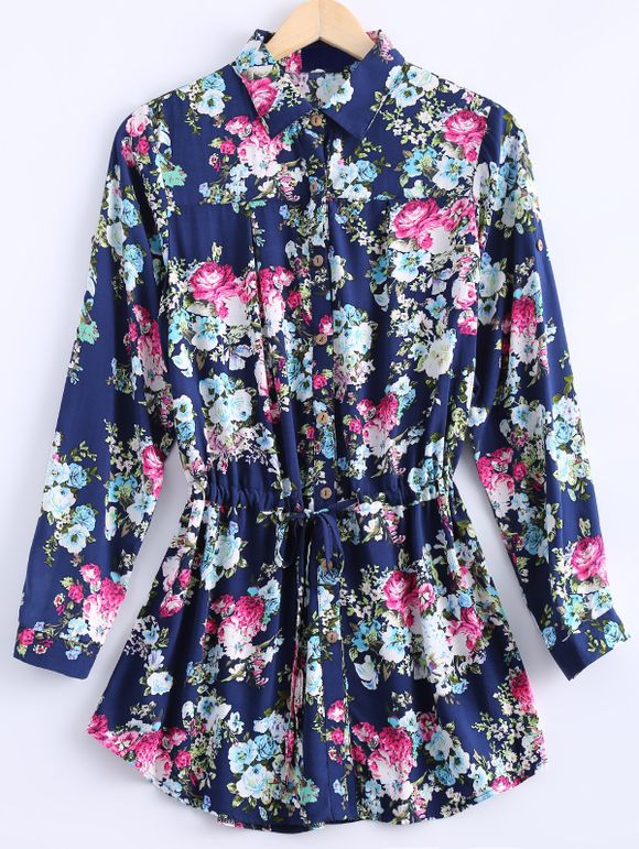 Femmes Vintage  's manches longues imprimé floral Robe chemise - Bleu Marine ONE SIZE(FIT SIZE XS TO M)