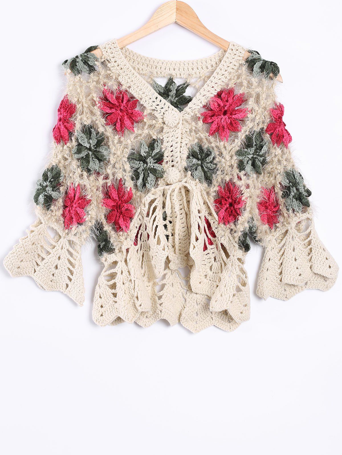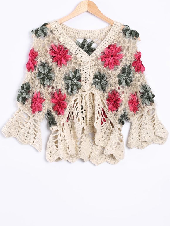 Floral Crochet ajouré col V Cardigan - Blanc Cassé ONE SIZE