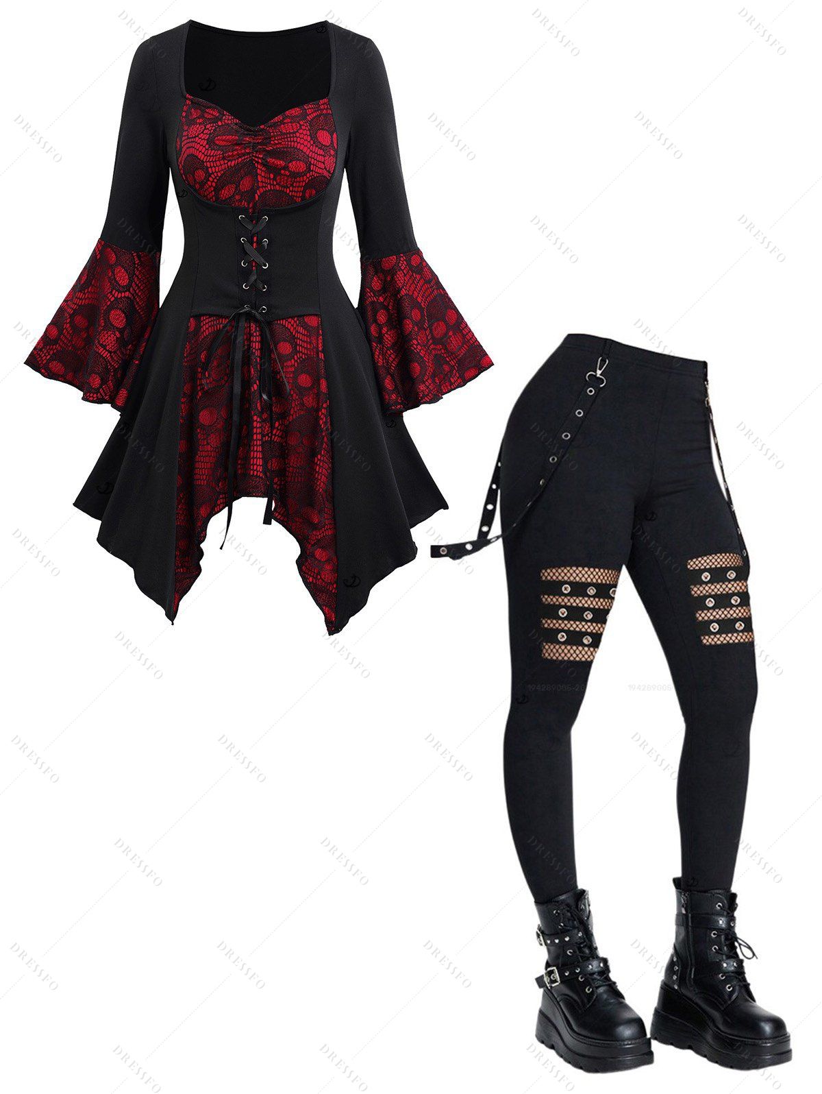 Gothic Outfit Colorblock Skull Lace Up Handkerchief Hem Top and Pants Set