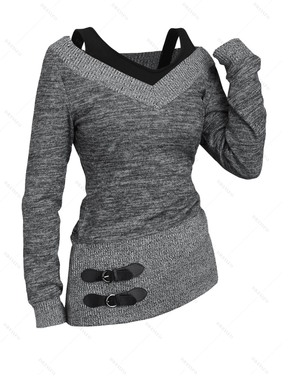 Haut 2 en 1 texturé à manches longues et col en V en similicuir chiné - Gris Foncé S | US 4