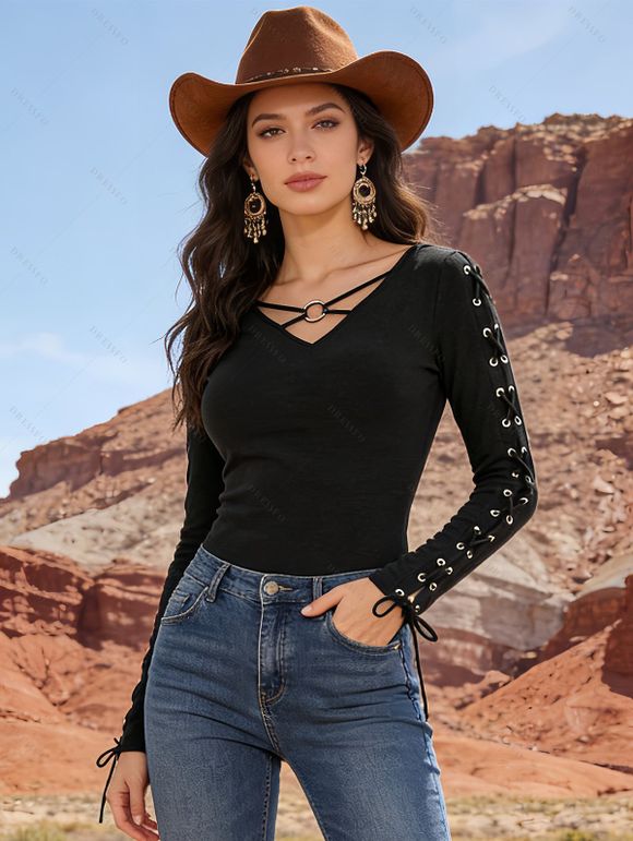 Haut ajusté à manches longues et col rond Solid VO à lacets - Noir XXL | US 12