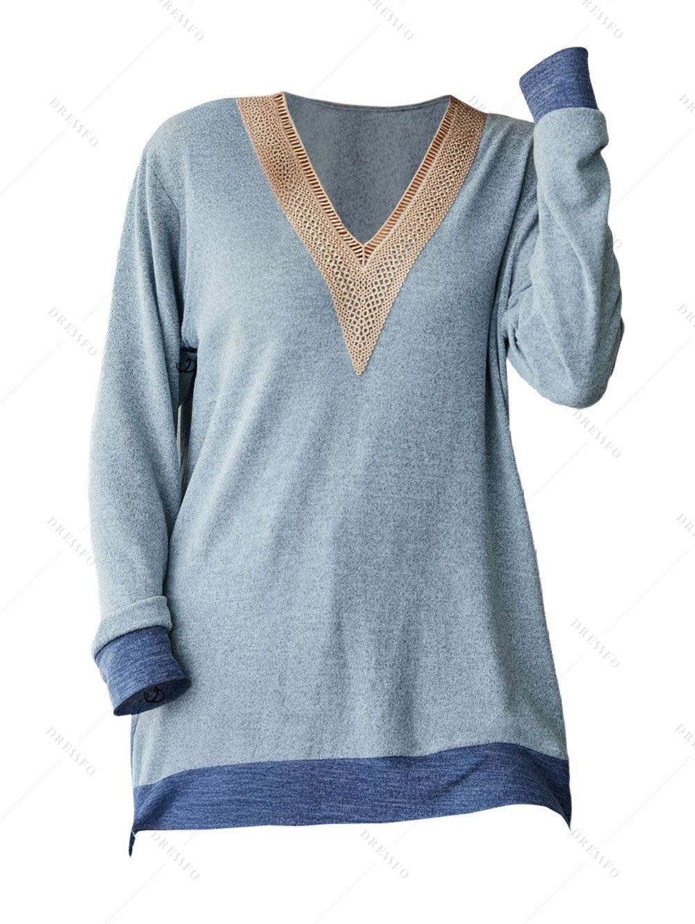 Haut colorblock à empiècement en dentelle ajourée et col en V à manches longues - Bleu clair XXL | US 12