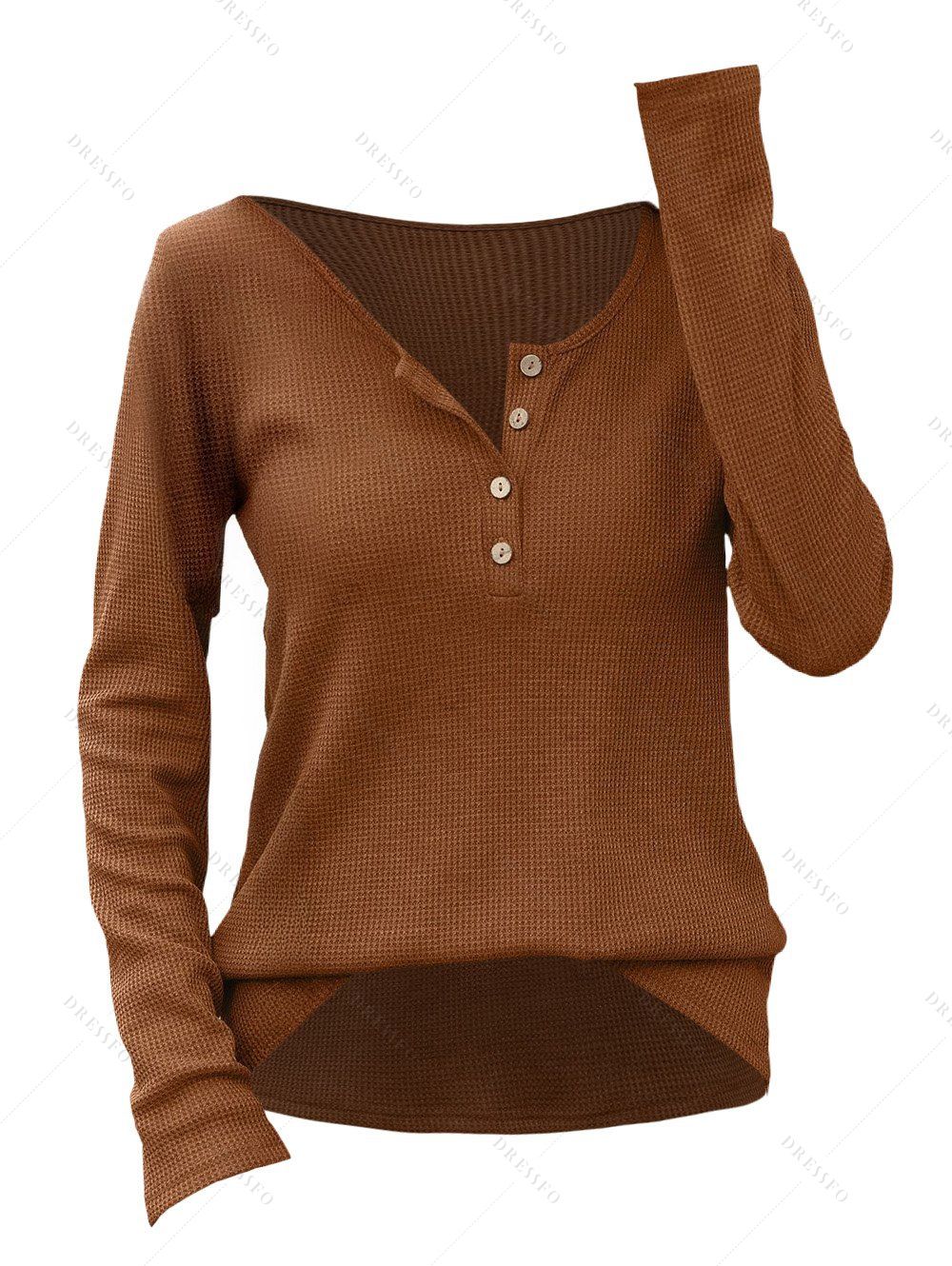 Haut décontracté de couleur unie, haut à manches longues avec boutons texturés - Café profond XXL | US 12