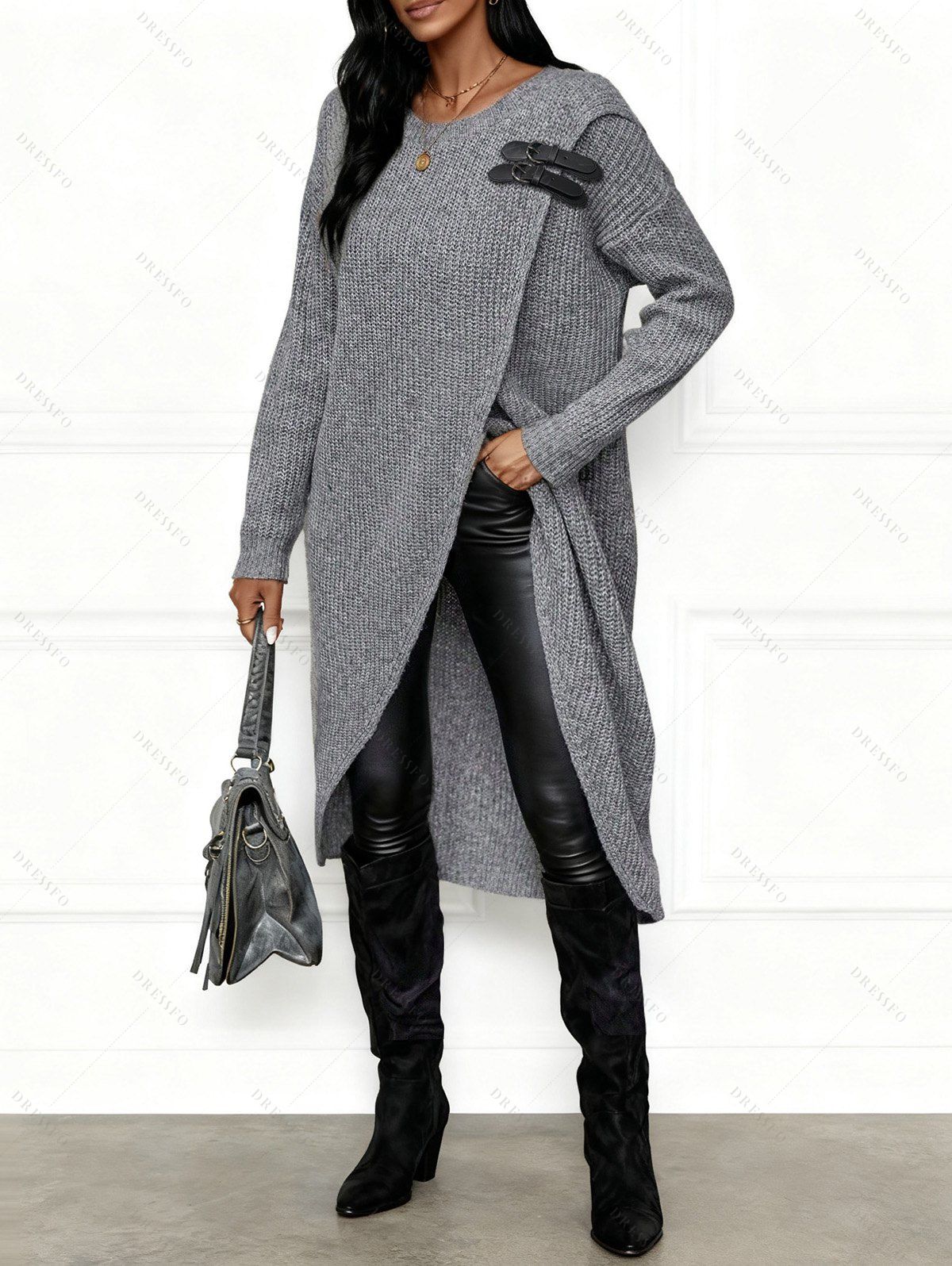 Haut en tricot long de couleur unie, pull à bretelles avec boucle et superposition - Gris XL | US 12