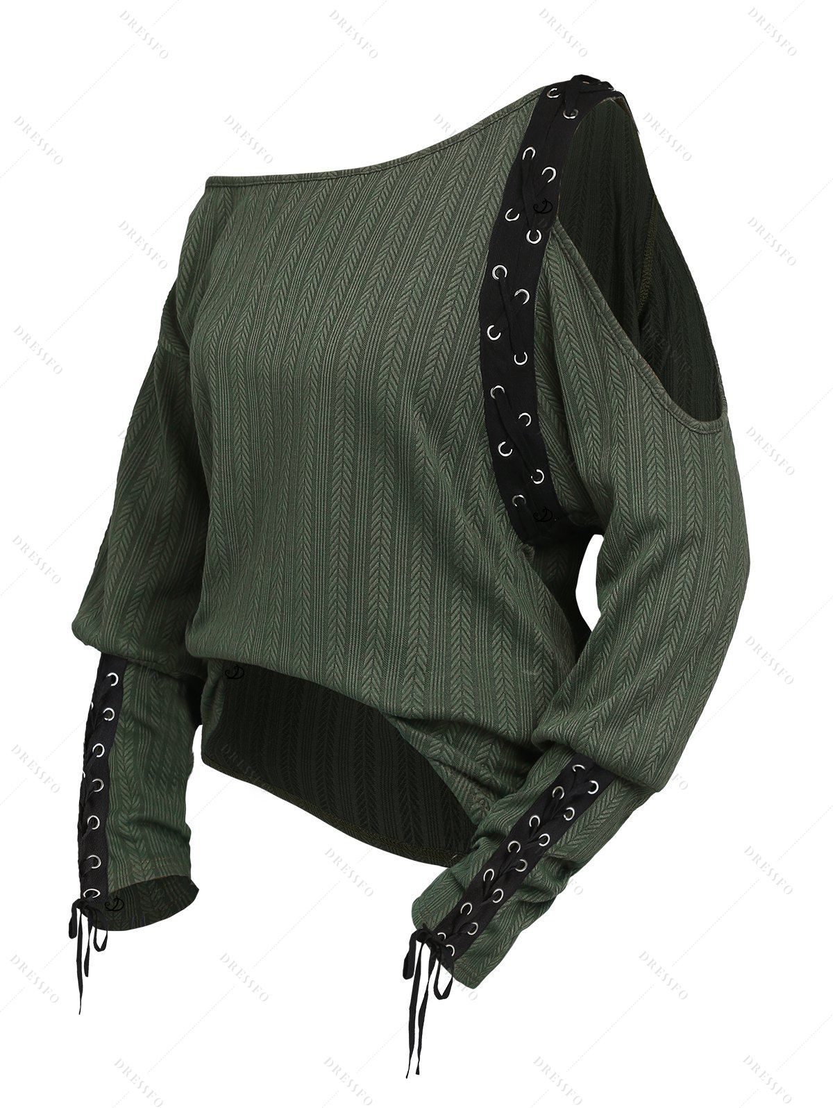 Haut texturé de couleur unie à lacets et découpes, col oblique, manches longues - Vert XXL | US 14