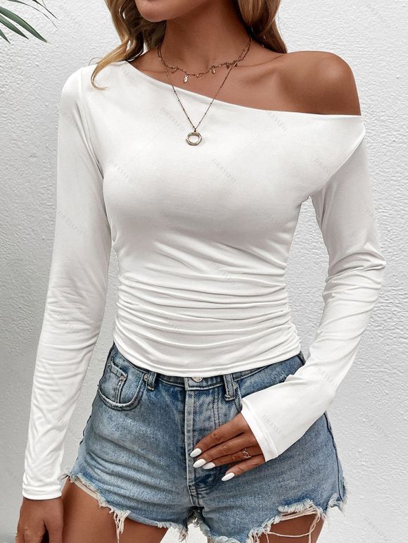 Haut uni à col asymétrique et manches longues froncées - Blanc L | US 8
