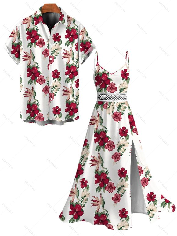 Hawaii Vacation Couple Outfit Tropical Hibiscus Floral Leaf Print Lace Hollow Out Slit Dress and Shirt Set - Blanc S | US 4