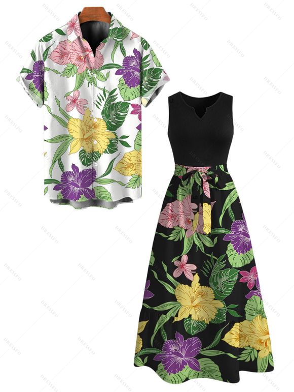 Hawaiian Couple Outfit Vibrant Iris Lily Colorful Floral Print V Notched Belt Dress and Shirt Set - Noir S | US 4