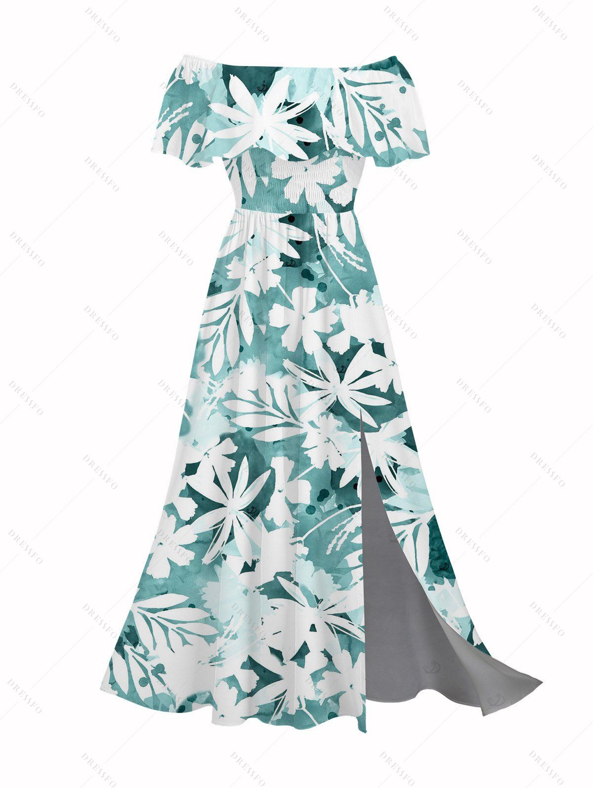 Hawaiian Dress Tie-Dye Tropical Leaf Print Flounce Off the Shoulder Slit Dress - Turquoise XXL | US 14