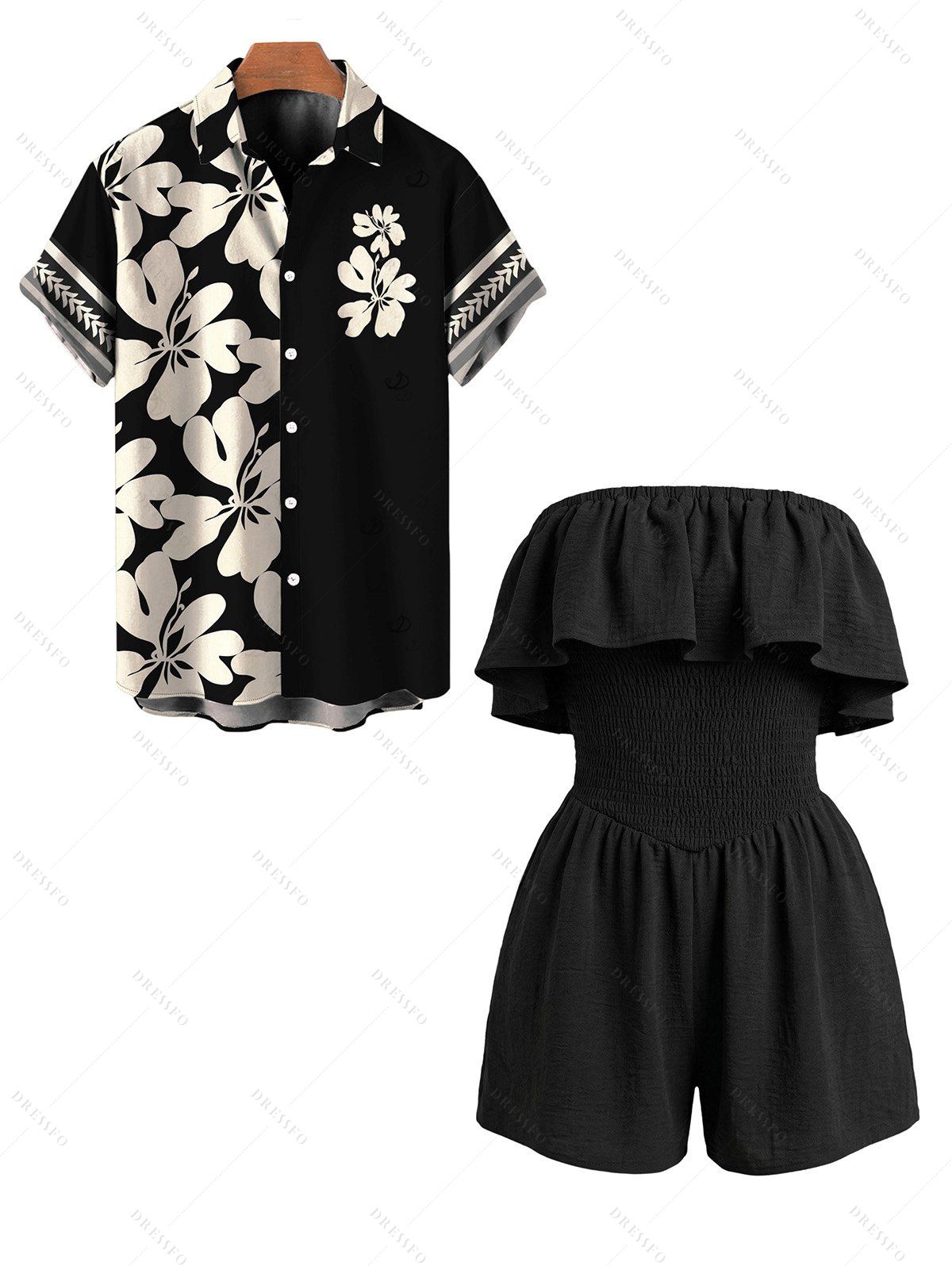 Hawaiian Vacation Couple Outfit Solid Color Flounce Smocked Off the Shoulder Romper and Tribal Floral Print Shirt Set - Noir S | US 4